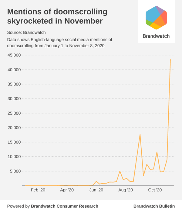 When Brandwatch checked out English-language mentions of the term on social media using their Consumer Research platform, they found 144,000 mentions of it from January 1st to November 8th 2020. Mentions really started picking up in June 2020, and recently, usage has hit a new high, skyrocketing already this month with 45,000 mentions from people admitting that they were guilty of doomscrolling in the first week of November.